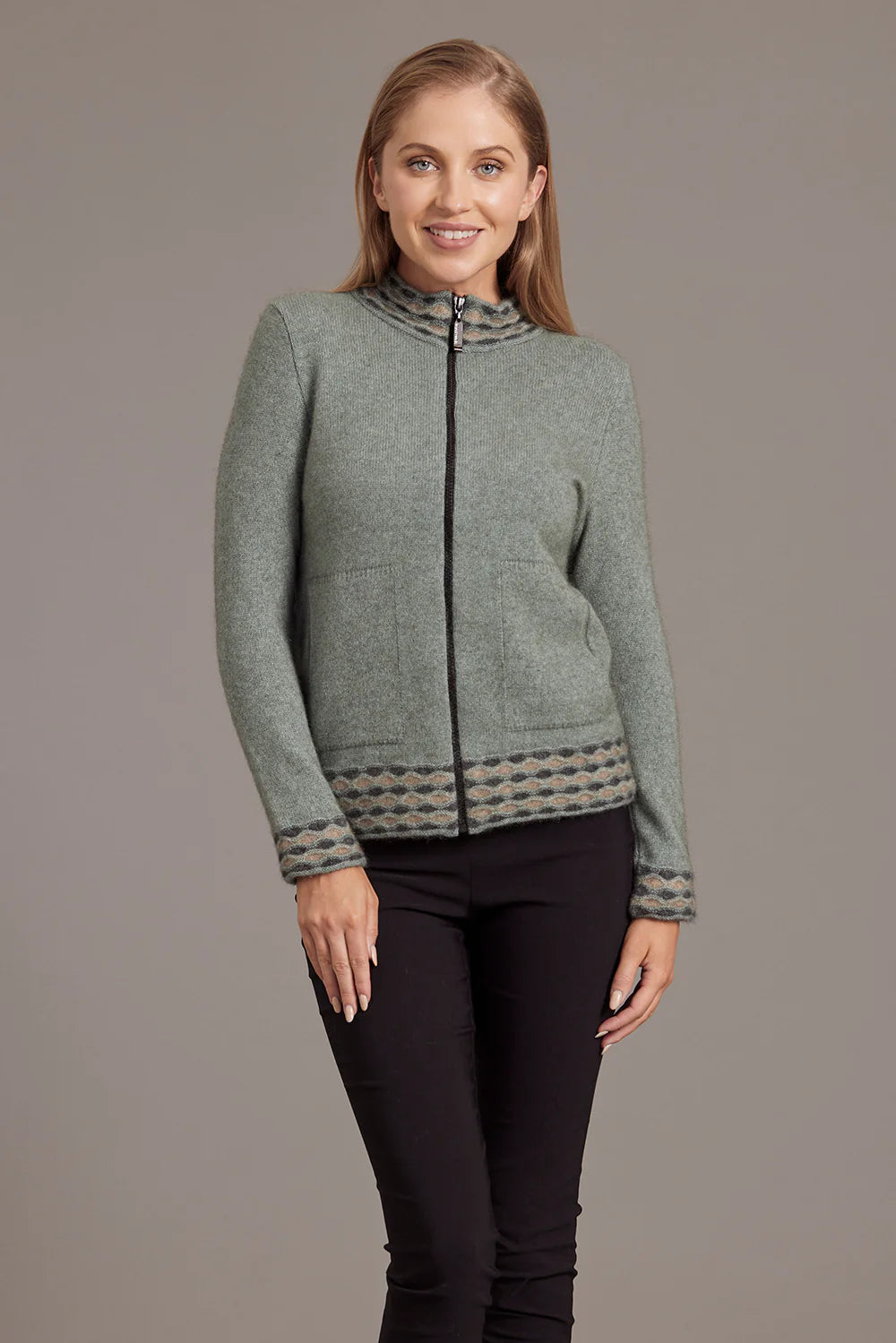 Wave Trim Zip Cardigan Zip up cardigan with pockets is more than just a casual throw-on piece with a wave trim detail on the neck and hems. The natural fibres of Possum Merino blended with Mulberry silk provide a luxurious comfort that will see this cardigan become your favourite go-to piece.