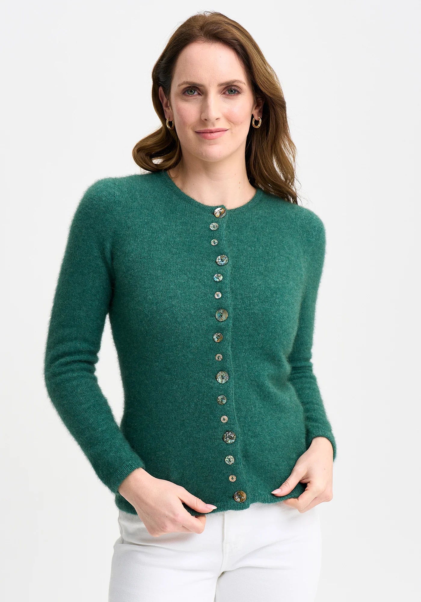 This cute crew neck cardigan features paua shell buttons of varying size to add sophistication and a pop of colour. But fear not, many of the buttons are decorative, meaning you don't need to fret about time on busy mornings! Designed to give a fitted silhouette, this cardigan will be a go-to for work days or weekends.